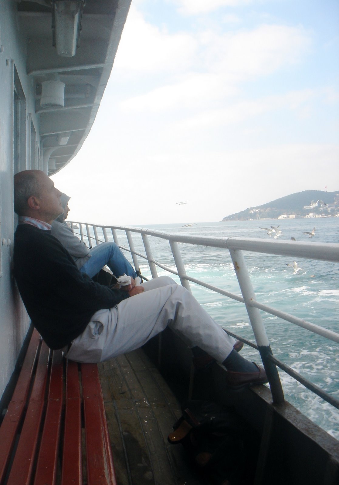 Her zamanki gibi son anda vapura yetisip vapurun iskele tarafinda Adalar’a nazir yerimi alacaktim ki Gunduz Vassaf’in gozlerini dinlendirmekte oldugunu gorup rahatsiz etmeyeyim dusuncesiyle daha ileriye gecmeyip buldugum yere oturdum usulca! Arada goz ucuyla, gozlerini acarsa bir merhaba diyeyim diye bakmaktayken, elinde tutmakta oldugu havlu kagitlara ve ayaginin atindaki cantaya gozum takildigi anda da yazmaya basladim: Ah! Boston’a donuyor zaar… Eh! Adalar’dan ayrilmanin huznuyle avuc dolusu kagit mendil, bir dahaki sezona degin yetecek kadar cigerlerine Adalar’in deniz havasini olabildigince doldurmak uzere basini da semaya kaldirmis olmali… Elveda Adalar… Elveda martilar… Elveda deniz… Gelecek seneye yine gorusecegiz! Ve dahi bu ani belgeleyeyim supriz bir mektupla da kendisine gondereyim diye gizlice alelacele bir fotografini bile cektim!