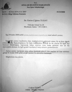29 Aralik 2008 tarihli “Buyukada’da motorize hirsizlik!” baslikli ekteki arzuhalime cevaben vermis oldugunuz “magduriyetinizi gidermek amaci ile en kisa surede evinizin onune Baskanligimizca bir bank konulacaktir” ibaresini iceren 31/12/2008 tarih ve M.34.6.ADA.0.11/2837 sayili yazinizi bugun almis ve hayretle okumus bulunuyorum. Oysaki ekteki ilgili basvurumda da acikca belirttigim “magduriyet” maddi degerinin lafi bile olmayacak ahsap sira falan degildi asla!