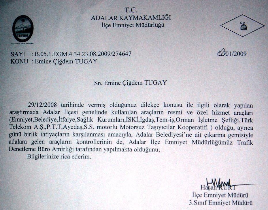 b- Adalar Ilce Emniyet Muduru Hasan Kurt: “29/12/2008 tarihinde vermis oldugunuz dilekce konusuyla ilgili olarak yapilan arastirMAda Adalar Ilcesi genelinde kullanilan araclarin resmi ve ozel hizmet araclari (Emniyet, Belediye, Itfaiye, Saglik Kurumlari, ISKI, Igdas, Tem-İs, Orman Isletme Sefligi, Turk Telekom AS, PTT, Ayedas, SS Motorlu Motorsuz Tasiyicilar Kooperatifi) oldugu ayrica gunubirlik ihtiyaclarin karsilanmasi amaciyla Adalar Belediyesi’ne ait cikarma gemisiyle Adalara gelen araclarin kontrollerinin de Adalar Ilce Emniyet Mudurlugumuz Trafik Denetleme Buro Amirligi tarafindan yapilmakta oldugu…”
