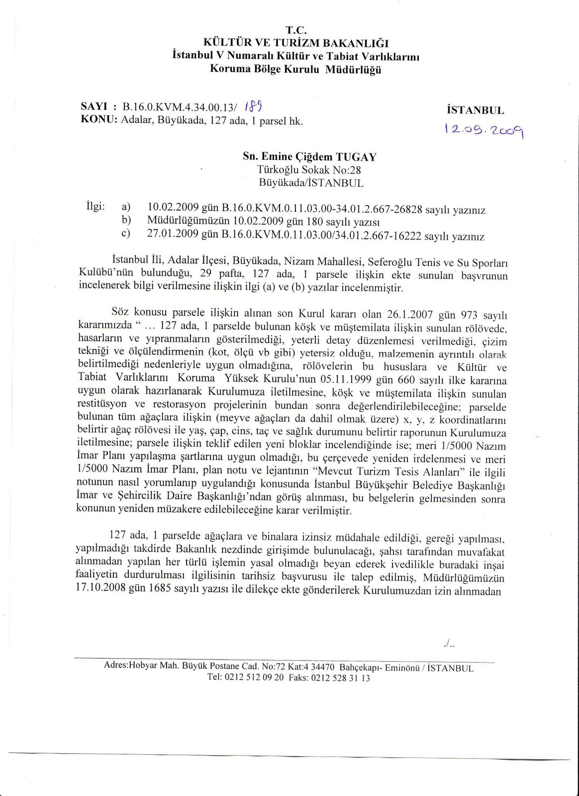 1- Istanbul V. Numarali Kultur ve Tabiat Varliklarini Koruma Bolge Kurulu muduru Dr. A. Metin Yildirimli: “Soz konusu parselde [Seferoglu], Kurulumuzdan izin alinmadan herhangi bir insai faaliyet ve fiziki mudahalede bulunulmamasi, izinsiz yapilan islemler varsa ivedilikle durdurularak konuyla ilgili Mudurlugumuze bilgi verilmesi hususunda ilgi (b) yaziyla Adalar Belediye Baskanligi’na yazi yazilmistir (Ek:3). Konuya iliskin olarak Mudurlugumuze herhangi bir bilgi belge iletilmemistir…”