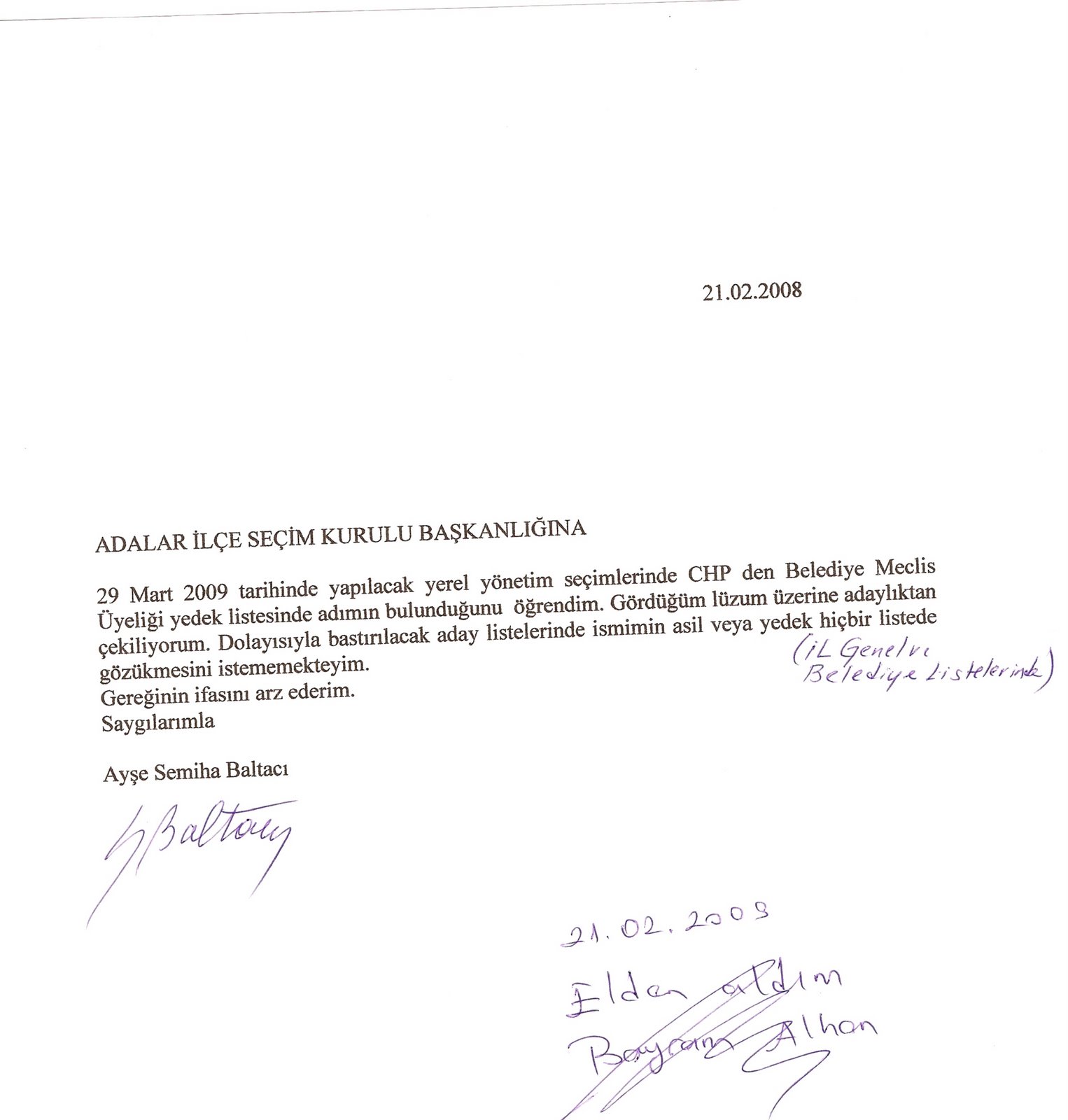 1- Semiha Baltaci: “Partinin yetki verdigi bu sahislarin insan kisiligiyle lastik top gibi oynamalarina masaade etmeyerek tasarrufum olmayan listeden Ilce Secim Kurulu’na verdigim istifa dilekcesiyle ayrildim. Demokrat kamuoyuna bildirilir…”