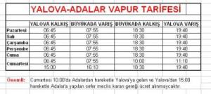 6- Adalar halkinin Yalova’dan alisveris yapmasini saglamaya yonelik olarak Yalova Belediye Meclisi’nce alinmis karar uyarinca: Yalova pazarinin kuruldugu Cumartesi gunleri saat 10:00’da Buyukada’dan hareketle 11:10’da Yalova’ya varip 15:00’te Yalova’dan hareketle 16:10’da Buyukada’ya donecek Buyukada-Yalova vapur seferlerinde yolcu ucreti alinmayacaktir…