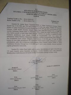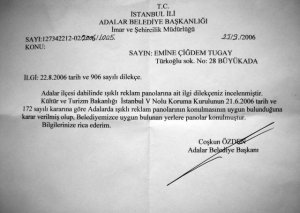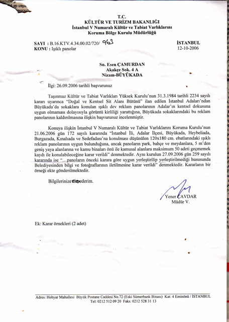 22 Agustos 2006 tarihli dilekcemize Adalar Belediye Baskanligi’ndan gelen aciklaMA’ya gore: “Istanbul 5. Numarali Kultur ve Tabiat Varliklari’ni Koruma Kurulu’nun 21.6.2006 tarih ve 172 sayili kararina gore Adalar’a isikli reklam panolarinin konulmasina uygun bulunduguna karar verilmis olup” “Adalar Belediyesi’nce uygun bulunan yerlere panolar konulmus”mus.