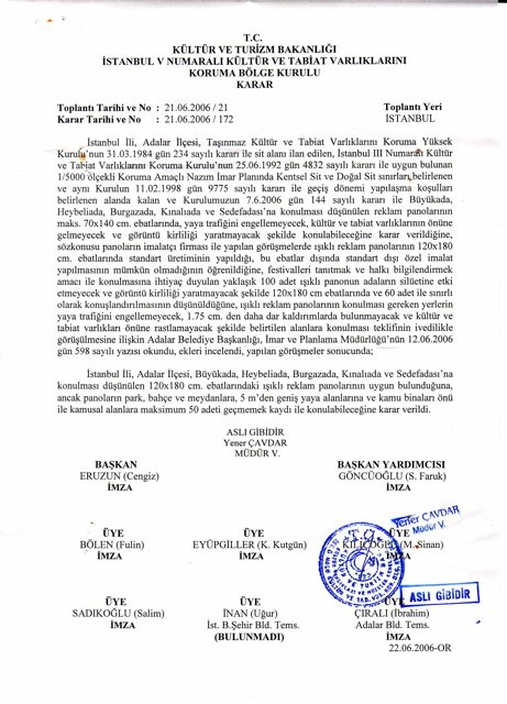 Marmara Takim Adalari’nin deger kaybetmesine vesile olan, hicbir estetik ve bedii deger ifade etmeyen, Adalarin yol, meydan ve caddeleri ile tarihi binalarini perdeleyerek kirleten, reklam amaci guttugu icin de SIT degerlerini gozlerden dusurerek kendisini tabiaten one cikaran, ticari amacli 120×180 cm. boyutlarindaki kotu gorunuslu (kerihul manzar), Adalar icin gereksiz, isikli veya isiksiz ilan tahtalarini; esefle ogreniyoruz ki Adalar Belediye Baskanligi tarafindan “IVEDILIKLE” Koruma Bolge Kurulu’nuzdan resmen taleb etmistir… (21.06.2006 / 172 sayili karar icerigi)