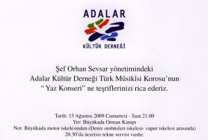 3- Adalar Kultur Dernegi: “Sef Orhan Sevsar yonetimindeki Adalar Kultur Dernegi Turk Musikisi Korosu’nun ‘Yaz Konseri’ne tesriflerinizi rica ederiz…”