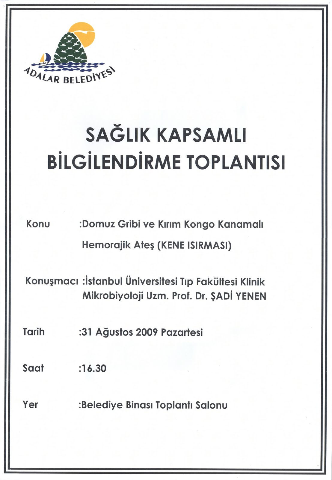 11- Dr. Doğan Başak: “31 Ağustos Pazartesi saat 16:30’da, Adalar Belediye Binası Toplantı Salonu’nda, İstanbul Üniversitesi Klinik Mikrobiyoloji uzmanı Prof. Dr. Şadi Yenen’in katılımıyla yapılacak ‘Domuz Gribi ve Kırım Kongo Kanamalı Hemorojik Ateş (Kene Isırması)’ konulu sağlık kapsamlı bilgilendirme toplantısına davetlisiniz…”