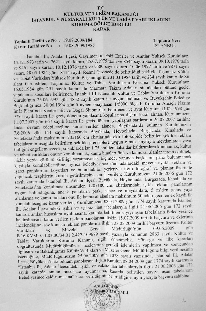 Ancak 23.5.2009 tarihli basvurumuz ve eklerine verilen 09.06.2009 tarih ve B.16.KVM.0.11.03.00.34.01.2.427-109679 sayili cevabi yazinizda uygulanmasi uygun bulunan 21.6.2006 gun 172 sayili karari takiben 08.04.2009 gun 1174 sayili karar, “bilimsel esaslar”i ve TC Kultur ve Turizm Bakanligi Tasinmaz Kultur ve Tabiat Varliklari Yuksek Kurulu’nun 31.3.1984 tarihli 2234 numarali karari uyarinca “Dogal ve Kensel SIT Alani Butunu” ilan edilmis olan Istanbul Adalari’nin, “Kentsel” ve “Dogal” SIT’e konu olan degerlerini herhangi bir yermiscesine yok sayarak salt “ticari” reklama donuk gelir elde etme kaygisiyla ustelik de “Festivalleri tanitmak ve halki bilgilendirmek,” kisvesi altinda, Belediyesi’nce ivedilikle ilgili Kurul’dan izin talep edilip alinmak suretiyle yerlestirilen her biri adeta birer cirkinlik abidesi olup Kentsel ve Dogal SIT dokusunun bogrune adeta birer kazik misali saplanan reklam panolarinin tamaminin kaldirilmasi yonunde olmasi luzum ederken;