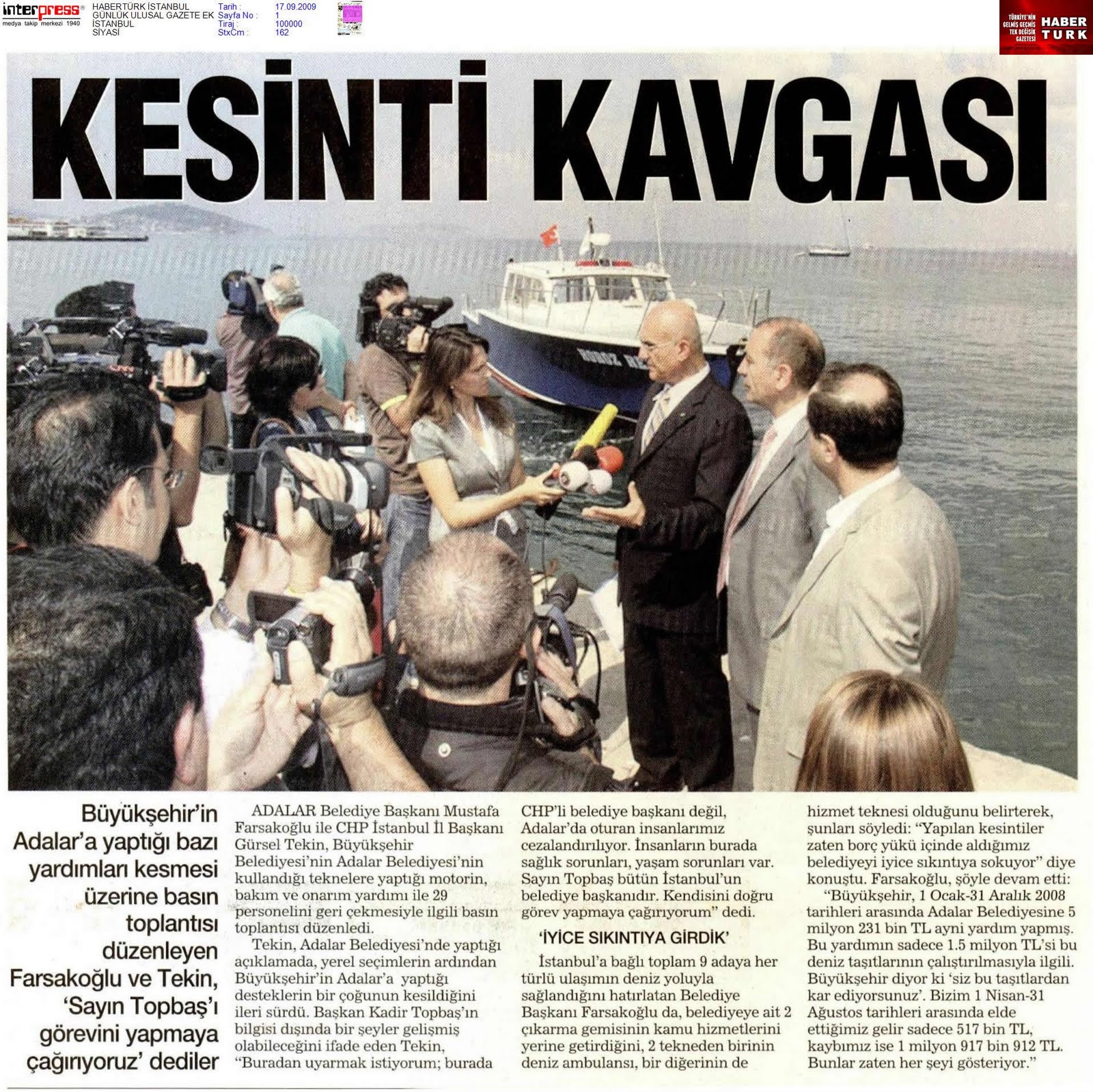 5- Volkan Koç: “Aralarındaki protokolün 31 Ağustos’ta sona ermesinin ardından, İBB’nin, Adalar’dan 29 personelini birden çektiğini söyleyen Farsakoğlu, ‘Bu yapılanlar bir cezadır. İBB bunları yaparak bizi cezalandırıyor. Kadir Topbaş’a iki kez yazı gönderdim, on defa da randevu talebinde bulundum ama nafile… Topbaş bize hiçbir şekilde cevap vermedi’ dedi…”