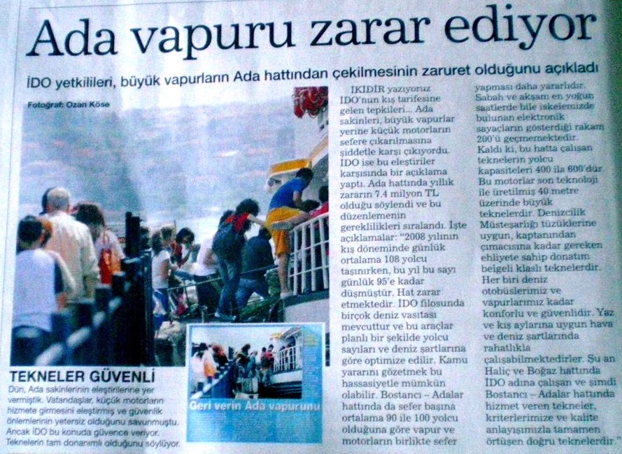 3- HaberTürk Gazetesi’nin 28.9.2009 tarihli İstanbul ekinde yayımlanan “Ada vapuru zarar ediyor” başlıklı haberde çocukların dahi inanmayacağı İDO zırvalarına cevaben: