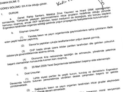 Mart 2009 tarihli “Kafes Operasyonu Eylem Planı”nın “Genel” bölümünde “Rahip Santaro, Malatya Zirve Yayınevi ve Hrant Dink operasyonları sonrasında Türkiye’de yaşayan gayrımüslimlerin irticai grupların hedefinde olduğu yönünde kamuoyu oluşmuş, ancak AKP tarafından karşıt medyanın da desteğiyle söz konusu olayların Ergenekon tarafından organize edildiği şeklinde yoğun propaganda faaliyetlerinde bulunulmuştur” deniyor.
