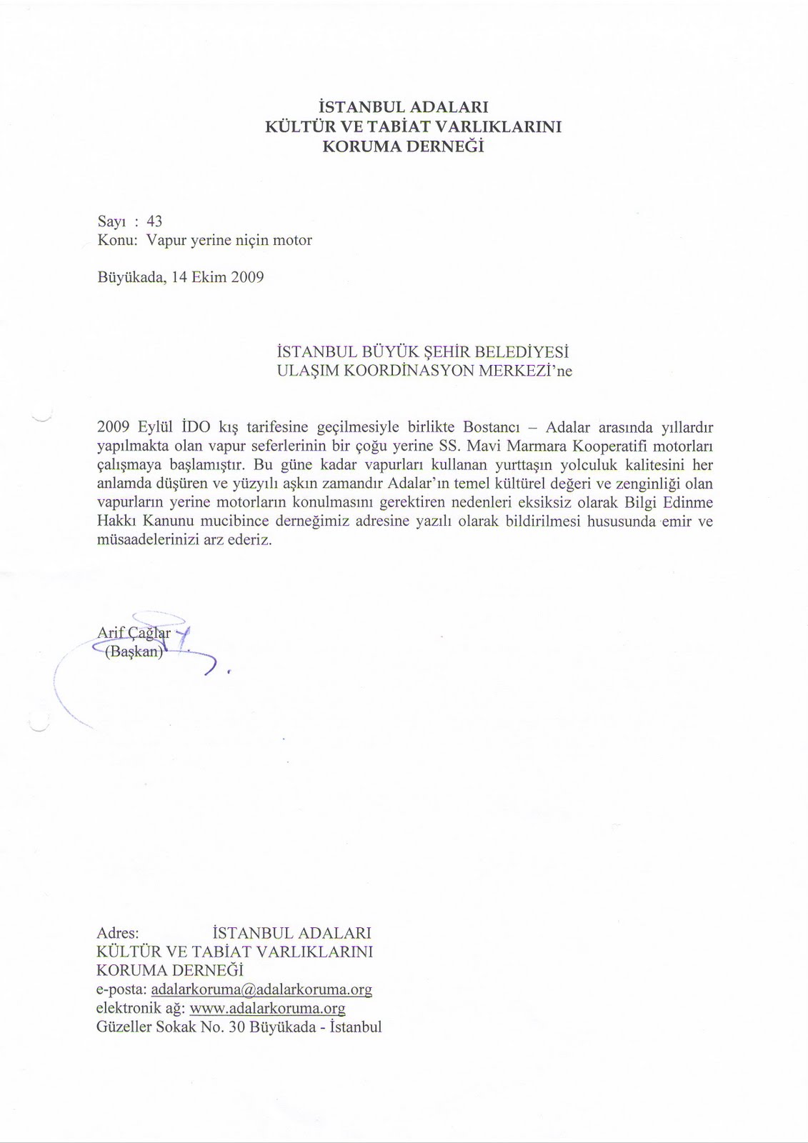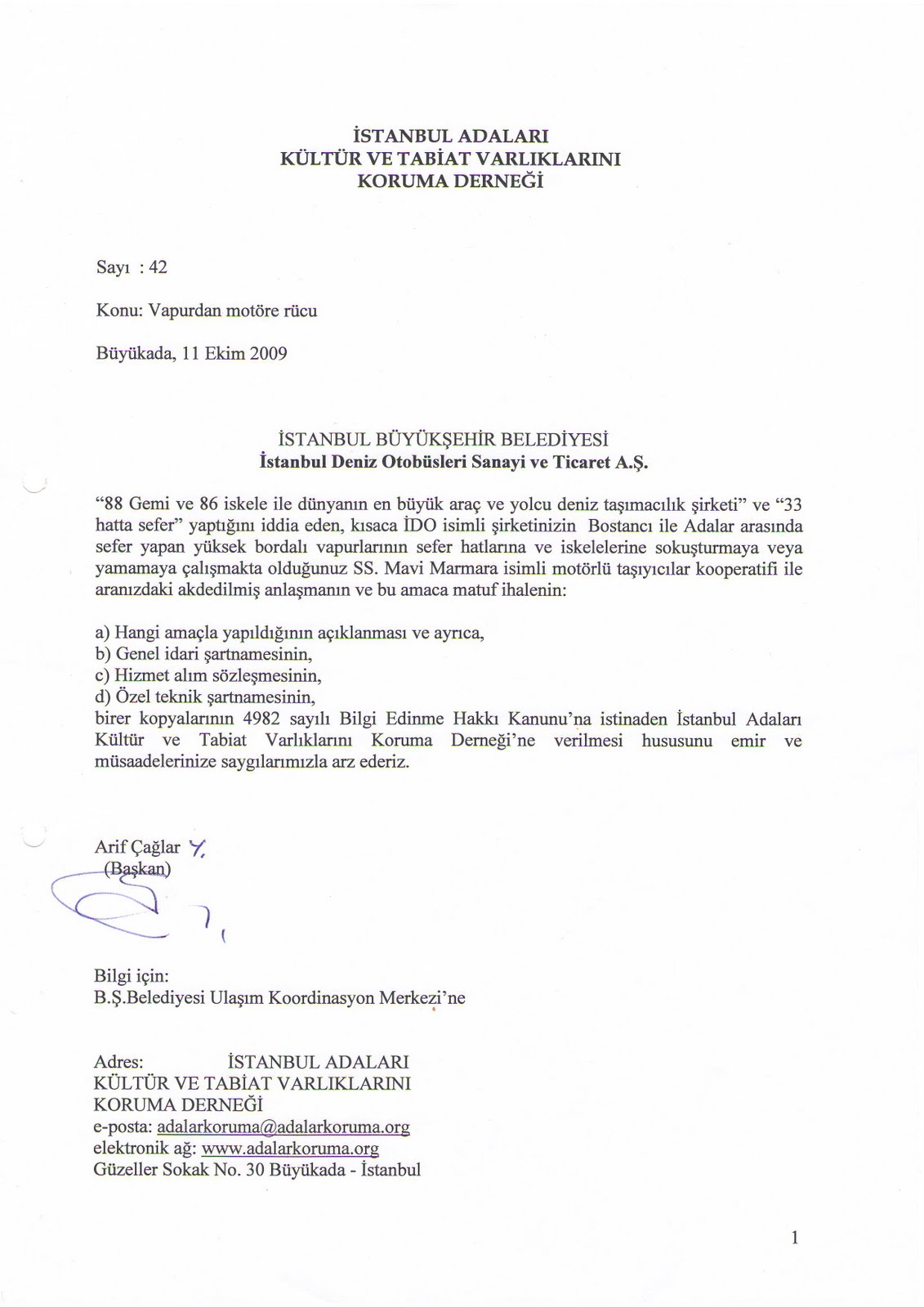 2- İSTANBUL ADALARI KÜLTÜR ve TABİAT VARLIKLARINI KORUMA DERNEĞİ: “İstanbul Deniz Otobüsleri San. ve Tic. A.Ş.’nin Adalar ve Bostancı vapur iskelelerine, vapur yerine motorları yanaştırma girişimi karşısında, derneğimiz kanuni ve hukuki girişimleri başlatmak üzere ilgililerden kanuni mesnet teşkil edecek bilgi talebinde bulunmuştur…”
