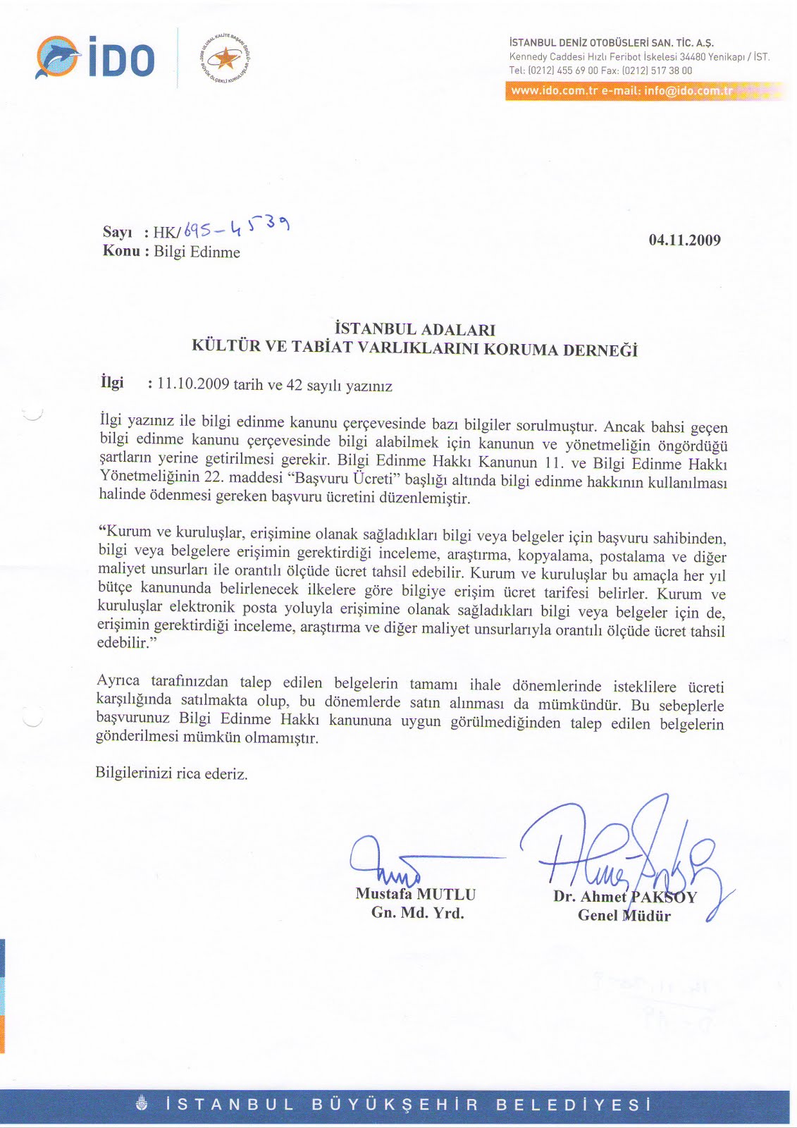 İstanbul Deniz Otobüsleri San. ve Tic. A.Ş.’ nden 11.10.2009 tarih ve 42 sayılı yazımızla taleb etmiş olduğumuz bilgileri vermeyen adı geçen şirketten bilgileri saklama emareleri ihtiva eden bir cevap alınmıştır.