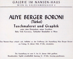 Özel sergileri Paris, Londra ve Viyana gibi büyük sanat merkezlerinde, katıldığı karma sergiler ise yine ondört yabancı kente açılmıştı. Bu arada, sanatçının İstanbul Resim Heykel Müzesi’nde dört, Albertina Museum’da da üç yapıtı sergileniyor. Aliye Berger gravür sanatına geç başladı, ama bu sanatıyla yaşadığından, az zamanda rekor denecek sayıda yapıt üretti. Ne var ki, onun bu sanatta doruğa çıkmasını, hayatını uğruna adadağı aşkı, Karl Berger göremedi. Ama Aliye Berger onun şiirlerini derledi ve gravürlerini yaptı. 1974 yılında sanat dolu yüreği duruverdi. O, ölümünden sonra büyük aşkı Karl Berger’e kavuşacağına inanırdı. Belki de öyle olmuştur!… Aliye Berger’in yapıtları ölümünden sonra sergilendi. Bunlar arasında iki büyük sergiye değinmek yerinde olur. 16 Ekim- 1 Kasım 1975 tarihleri arasında Devlet Güzel Sanatlar Akademisi’nde düzenlenen sergi bunlardan ilkidir. İkincisi ve sonuncusuysa Yapı Kredi Bankası’nın 11 Şubat-6 Mart 1988 tarihleri arasında düzenlediği Aliye Berger’in seksen kadar yapıtını kapsayan sergidir.