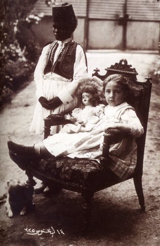 2- Taha Toros: “Büyük ailenin küçük çocuğu Aliye, büyük bir özen ve sevgiyle büyütüldü. Yukarıdaki fotoğraf 1909 yılında Büyükada’daki Şakir Paşa Köşkü’nün bahçesinde çekilmiş. Küçük Aliye bebeği, koltuğun altında köpeği ve arkasında Habeşiştan’dan getirilen bakıcısı Seyfettin ile poz vermiş…”