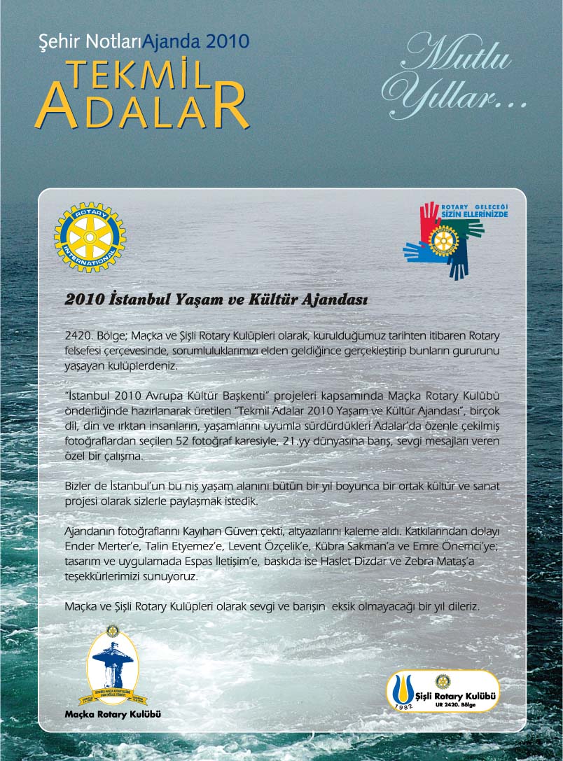 2010 Tekmil Adalar Yaşam ve Kültür Ajandası Maçka Rotary bünyesinde aylarca süren bir çalışmayla hazırlandı. Mekânlar tespit edildi ve çekimler için bütün adalar ziyaret edildi.