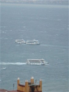 20/12/2009 9:28’deki Lodos çalkantısında Büyükada sahillerinde iki mopur dakikalarca yana yalpa bata çıka anca birbirlerine tutundu biçare!