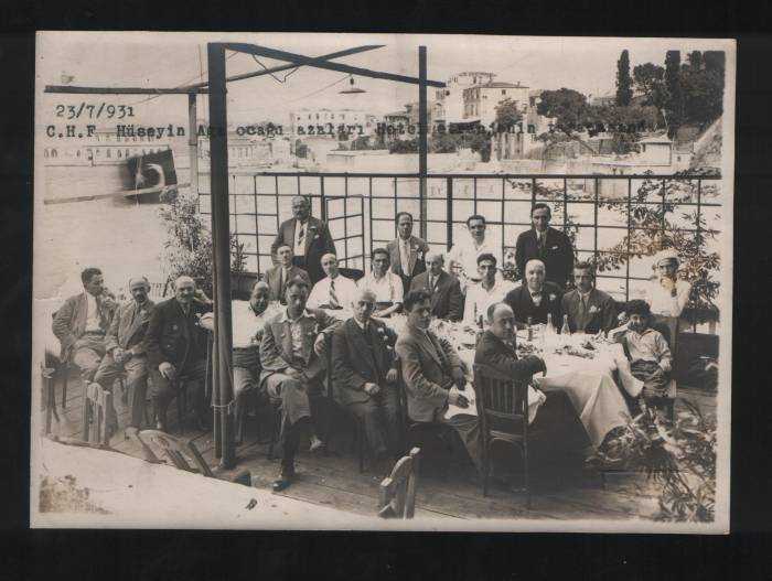 CHF (Cumhuriyet Halk Fırkası) Hüseyin Ağa Ocağı azalarının Hotel Etranjer’in terasındaki yemekli toplantısından bir anı fotoğrafı.