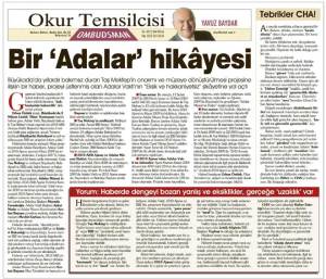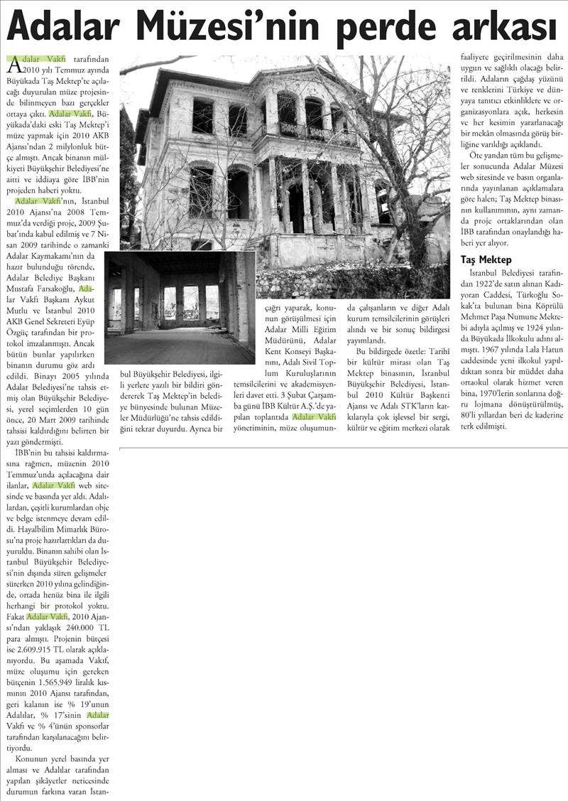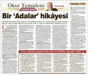 16- Adalar Müzesi: “Adalar Müzesi çalışmalarına başlamamızdan ve belirli aşamaya gelmemizden sonra, özellikle, müzenin yerleşeceği binanın sahipliği ekseninde söylentiler, yayınlar başlamıştı. Bunlardan yerel olan ve yanıtlamaya bile gerek görmediğimiz kadar temelsiz olan iki tanesinden sonra, 4 Şubat günlü Sabah gazetesinde, yine temelsiz, ne yazık ki üzücü bir “haber” çıktı. Bunun üzerine hem tüm söylentilerle ilgili olarak hem de bu “haber”le ilgili olarak bir basın açıklaması yapmak gerekti. Bu açıklamayı sizlerle de paylaşmak istiyoruz…”