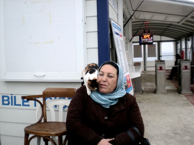 İşte böyle böyle kendimizi insanlardan uzakta tutmaya çalışırken hayvanların saf ruhlarına daha da yaklaşır buluyorum. Maden bölgesinin tüm kedileriyle pek içli dışlı olduk bu kış… Her ne kadar Sayın Arif Çağlar, kışları tüm mahlukatın beslenmesi gerektiğini çok haklı olarak yazsa da benim de elimden gelen bu… Ancak bir şeye dikkat ediyorum, kediler beslenirken, köpekler de geliyor yanlarına ve hatta kargalar, martılar da aynı anda yiyorlar. Belki böylece kırıntılar da karıncalara yarıyordur. Hele bir keresinde gördüğüm bir manzara beni çok şaşırttı… Sanırım Ada’da yaşayan evsiz konumunda bir insan var, konuştuğumda birisinin ona derme çatma bir baraka verdiğini orda kaldığını söyledi. Yazları bir çınarın altında kimseyi rahatsız etmeden birasını içerken sıkça görmüş olabilirsiniz kendisini. Belediye’ye yakın bir sokakta elinde buğday taşıdığı bir torbayla güvercinleri isimleriyle çağırıyordu; “Pamuuuk…” diye… İnanılmaz bir şekilde güvercinler sesi tanıyor olacaklar ki, hepsi birden pike iniş yaptılar… Ne güzel bir manzaraydı… Motor iskelesinde motor bekleyen kadının omzundaki kedi de görülmeye değerdi, fotoğrafını gönderiyorum.