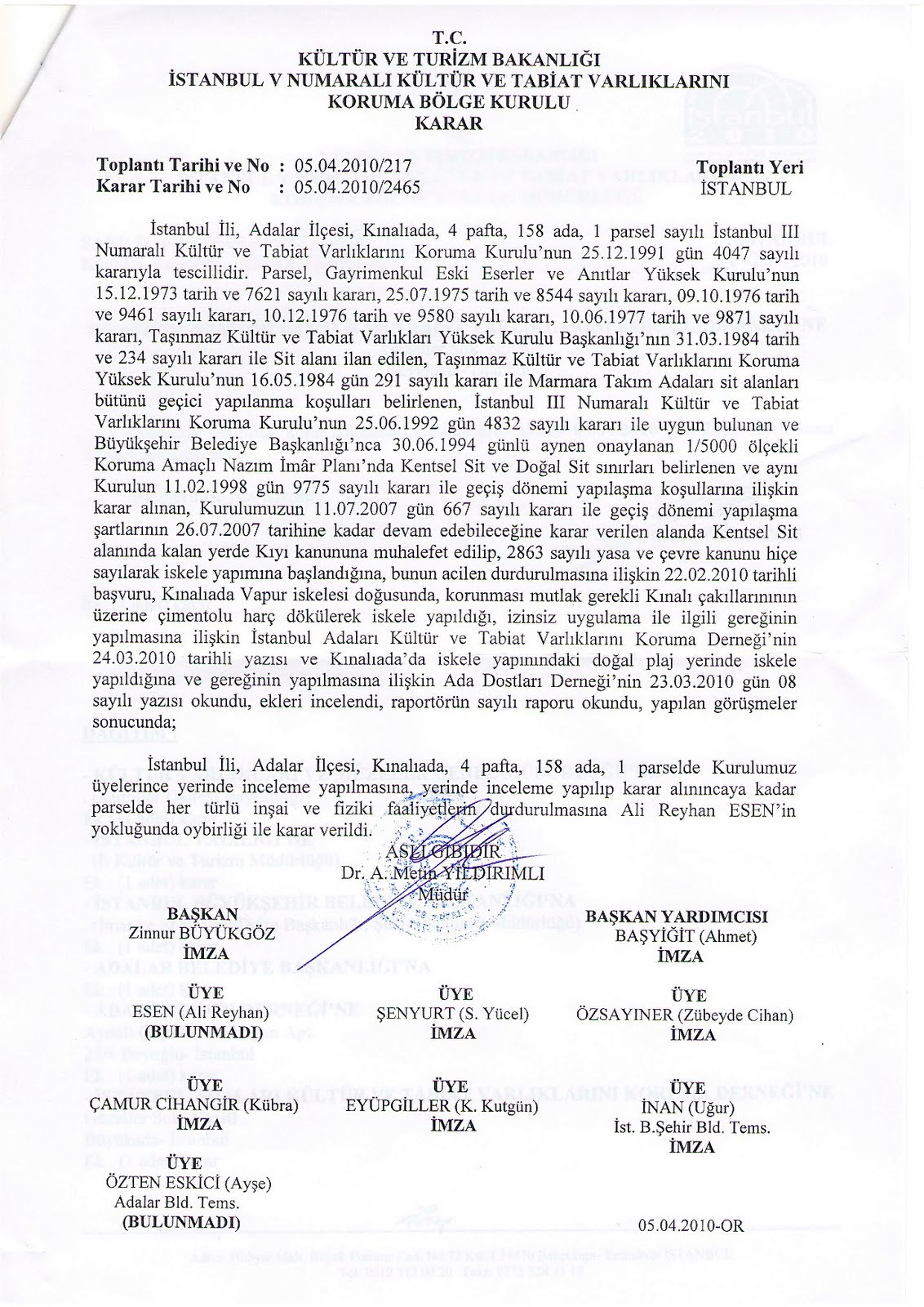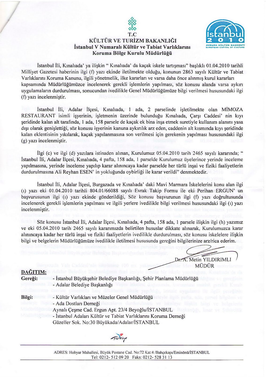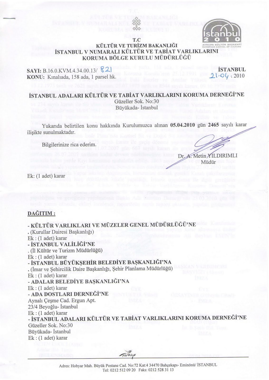 Bölge Koruma Kurulu’nun almış oldukları 05.04.2010 tarih ve 2465 sayılı karar ile 22.04.2010 tarih ve 834 sayılı cevap yazılarının suretlerini Adalar kamu oyunun bilgilerine ve takdirlerine saygılarımızla arz ediyoruz.