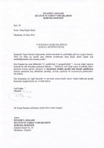 5- İstanbul Adaları Kültür ve Tabiat Varlıklarını Koruma Derneği: “Kınalıada sahilinde, kamu arazisi üzerine, bir ticari şirketin kaçak olarak iskele yapmasının görmezden gelinmesine karşı; İstanbul Adaları Kültür ve Tabiat Varlıklarını Koruma Derneği, Bölge Koruma Kurulu’na 24.03.2010 tarih ve 50 sayılı yazıyla müracaat etmiştir. Bunun üzerine, Bölge Koruma Kurulu’nun almış olduğu 05.04.2010 tarih ve 2465 sayılı karar ile 22.04.2010 tarih ve 834 sayılı cevap yazılarının suretlerini Adalar kamu oyunun bilgilerine ve takdirlerine saygılarımızla arz ediyoruz…”