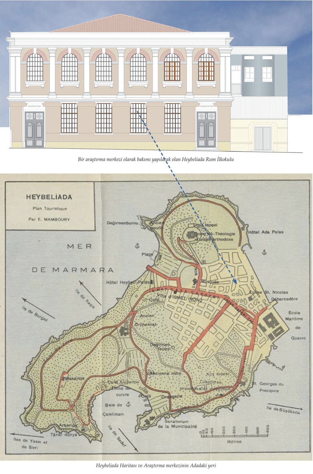Heybeliada Uluslararası Müzik Araştırma Merkezi’ne ev sahipliği yapacak olan bina, geçmişte, Heybeliada’daki Aya Nikola Kilisesi’ne bağlı Rum Ortodoks Vakfı’na ait bir ilkokul olarak faaliyet gösteri- yordu. Heybeliada tepesinin eteklerinde, sahile yakın bir konumda inşa edilmiş bulunan okul, İstanbul’lu Rum cemaatin önemli tarihsel miraslarından biri.