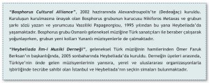 “Bosphorus Cultural Alliance”, 2002 haziranında Alexandroupolis’te (Dedeağaç) kuruldu. Kuruluşun kurulmasına önayak olan Bosphorus grubunun kurucusu Nikiforos Metaxas ve grubun şarkı sözü yazarı ve yorumcusu Vassiliki Papageorgiou, 1995 yılından bu yana Heybeliada’da yaşamaktadır. Bosphorus grubu Osmanlı geleneksel müziğine Türk sanatçıları ile beraber çalışarak yoğunlaşırken, grubun yeni kolları Yunanlı müzisyenlerle de çalmaktadır.