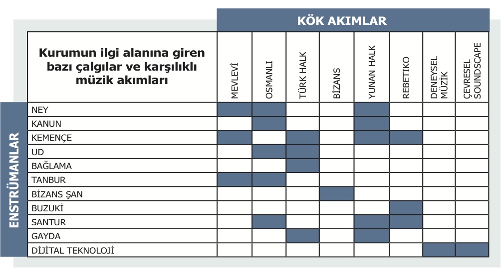 Kurumun ilgi alanına giren bazı çalgılar ve karşılıklı müzik akımları