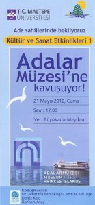 ‘İstanbul 2010 Avrupa Kültür Başkenti‘ etkinlikleri kapsamında Maltepe Üniversitesi Meslek Yüksekokulu ve Adalar Belediyesi’nin ortaklaşa düzenlediği ‘Kültür ve Sanat Etkinlikleri’ bu zengin mirası yeniden ele almanın, yaşatmanın ve geliştirmenin yollarını aramayı amaçlıyor.
