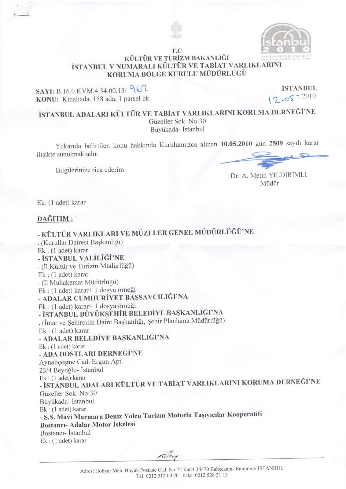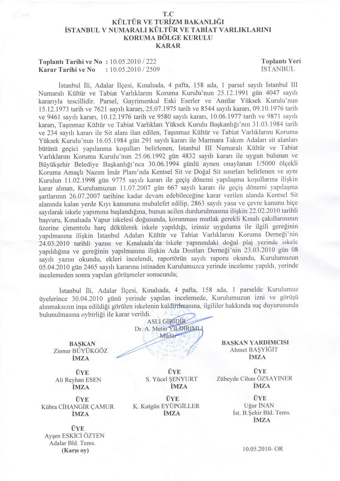 1- İstanbul Adaları Kültür ve Tabiat Varlıkları’nı Koruma Derneği ile Ada Dostları Derneği’nin başvuruları üzerine, İstanbul V Numaralı Kültür ve Tabiat Varlıklarını Koruma Bölge Kurulu Müdürlüğü’nün 30.4.2010 günü yerinde yaptığı incelemeyi müteakiben ekteki 12.5.2010 tarih 2509 sayılı kararıyla; Kıyı Kanunu’na muhalefetle, 2368 sayılı yasa ve Çevre Kanunu dahi hiçe sayılarak sözkonusu Kurul’un görüşü ve izni alınmaksızın inşaa edilen Kınalıada’daki korsan iskelenin kaldırılmasına, ilgililer hakkında suç duyurusunda bulunulmasına, —yalnız Adalar Belediye Temsilcisi’nin her nedense (?!) karşı oy kullanmış olmasına bakılmaksızın— Kurul asil üyelerinin “oybirliğiyle” karar verilmiştir. Kutlu olsun!