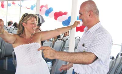 Adalarda tekne gezisinde avukat İrini Noti, Adalar Belediye Başkanı Mustafa Farsakoğlu’yla Rembetiko eşliğinde oynadı.
