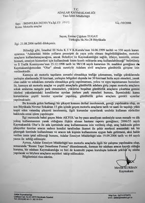 Adalar Emniyet Amirliği’nin 19.9.2006 tarih ve 64 sayılı yazısıyla Mete Akyol’a tebliğ edilen kararda geçen “aracın sadece kendisi tarafından, ikâmet ile şehir merkezi arasında tek bir güzergâh üzerinde kullanılması ve aracın tek kişinin kullanımına uygun hale getirilmesi aksi halde verilen iznin iptal edileceği,” ibaresinin alenen ihlalinden dolayı gereğinin gereği gibi yapılıp Mete Akyol’un golf arabasının ivedilikle bağlanarak Ada’dan çıkartılmasını ve tarafıma bilgi verilmesini arz ederim.