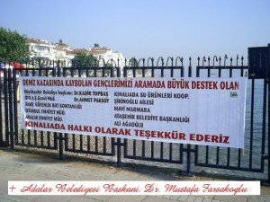 İskelede asılı bulunan kayıp Kınalıadalı 4 gencimizin bulunmasıyla ilgili ‘Teşekkür Afişi’nde, Adalar Belediyesi Başkanı Sayın Mustafa Farsakoğlu’nun (Dr.) adı unutulmuştur.