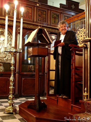 Günlerden, bir Pazar günü sabahi, Mihal’in baskani bulundugu ve ayni zamanda, mükemmel sesiyle, ayinler esnasinda dini sarkilari (ilahi), yüksek sesle bir opera sanatcisi gibi okudugu, bizim Besiroglu Sokaktaki (<– eski Kinali Hamam Sokak) Rum (Ortodoks) Kilisesinde, kimseyi rahatsiz etmemek icin makinanin *pips-sesini* kapatmis binanin giris kismina sehpami kurmus fotograf cekiyorum.