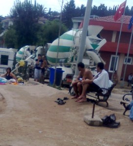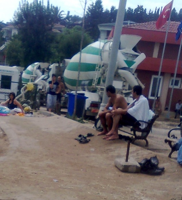 Otorite boslugundan istifade eden (<<<- yari sarhos) gencler, Efes refakatinda Belediye arabasinin (<<<- büfe) yanina koyduklari, (ve oradan aldiklari elektrikle) koskoca hopörlerle, yüzmeye gelen kizlara hava atiyorlar.