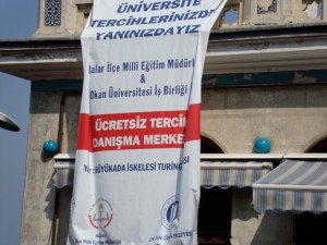 Dahası rüzgârda dalgalanarak kıvrılmış afişin fotoğrafından anlaşıldığı kadarıyla ‘işbirliğiyle’yi ayrı olarak ‘iş birliği ile’ şeklinde yazan Adalar İlçe Emniyet Müdürlüğü ve Okan Üniversitesi’nin ‘üniversite tercihleri’ danışmanlığından da ne hayır gelir meçhul mu malum mu? :)