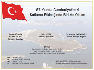 Büyükada, Heybeliada, Burgazada ve Kınalıada’da, 27-28-29 Ekim 2010 tarihleri arasında üç gün boyunca kutlanacak olan Cumhuriyet Bayramı etkinlikleri ile 28 Ekim akşamı Büyükada Anadolu Kulübü’nde Cumhuriyetten günümüze kadın giysileri defilesi, Atatürk’ün sevdiği şarkılar ve Folklor gösterisinden oluşan Cumhuriyet Kutlamaları’nda birlikte olalım.