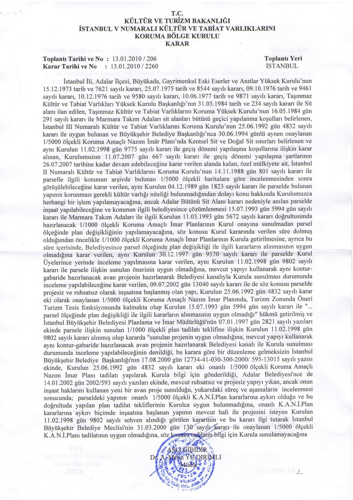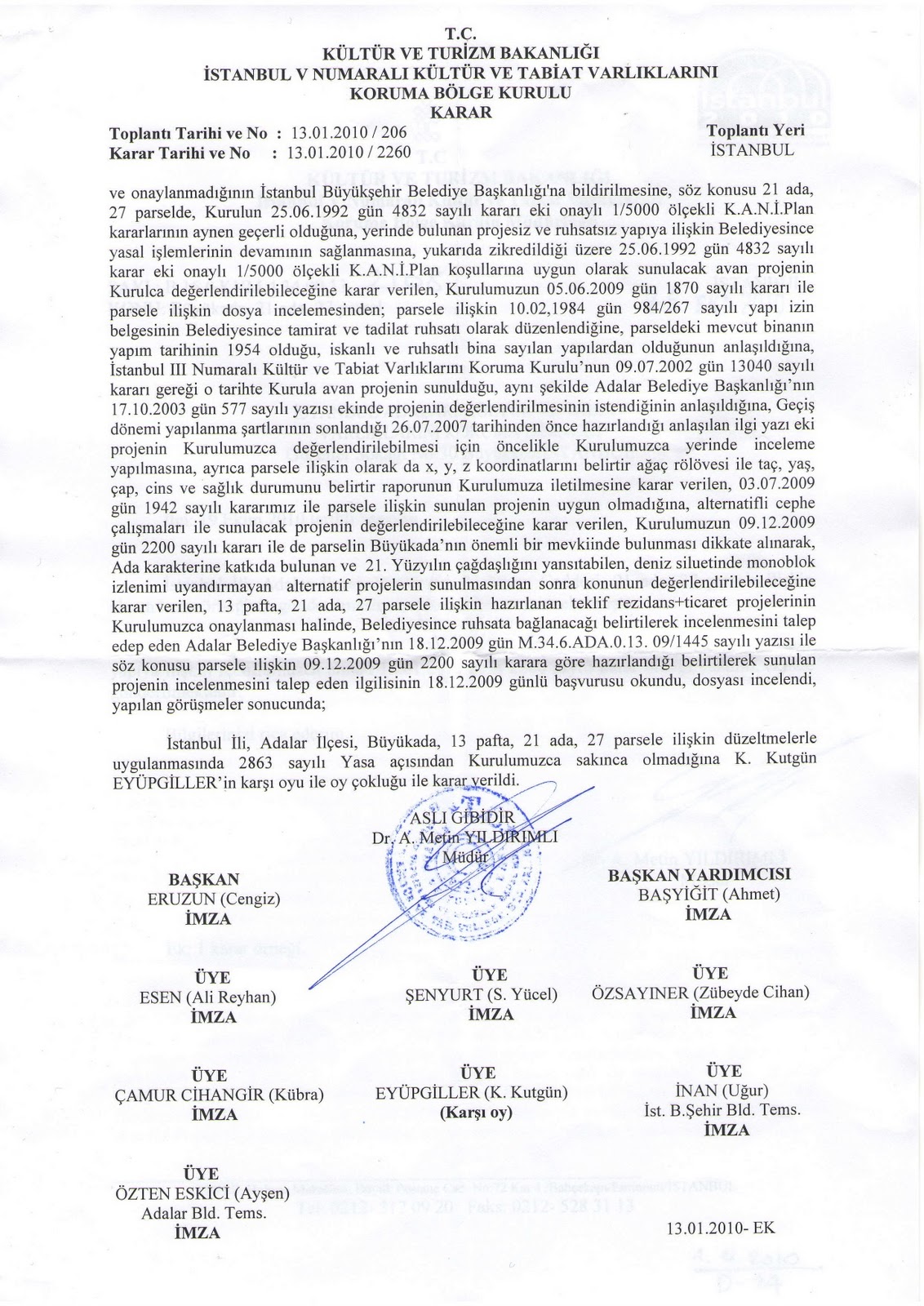 2- İstanbul V Numaralı Kültür ve Tabiat Varlıklarını Koruma Bölge Kurulu: “İstanbul ili, Adalar ilçesi, Büyükada 13 pafta, 21 ada, 27 parsele ilişkin düzeltmelerle uygulamasında 2863 sayılı Yasa açısından Kurulumuzca sakınca olmadığına K. Kutgün Eyüpgiller’in karşı oyu ile oy çokluğuyla (başkan Cengiz Eruzun, başkan yardımcısı Ahmet Başyiğit, üye Ali Reyhan Esen, üye S. Yücel Şenyurt, üye Zübeyde Cihan Özsayıner, üye Cihangir Çamur, İst. B. Şehir Bld. Tems. Uğur İnan, Adalar Bld. Tems. Ayşen Eskici Özten) karar verildi…”