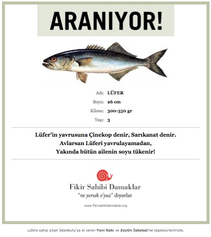 Slow Food, Fikir Sahibi Damaklar hareketi ve TÜDAV işbirliğinde gerçekleşen “İstanbul Lüfer’e Hasret Kalmasın!” kampanyası sürecinde edindiğim kanaat ise lüfer balığının henüz 14 cm’lik bir çinekop, yani bir bebek lüferken, henüz yumurta bile bırakmamışken avlanmasına müsade edildiği yönünde.
