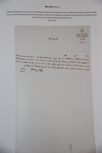 “Adaların İstanbul’un en güzel mesire yeri olduğu, bunun en önemli göstergesi olan çamlıkların mutlaka korunması için Kınalıada’dan başlayarak bütün adaların kadastrosunun yapılması gerektiği” konusunda, Sadaret’ten (Başbakanlık), Dahiliye Nezareti’ne (İçişleri Bakanlığı) gönderilen yazı…