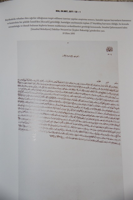 “Büyükada’da vebadan ölen sığırlar olduğunun tespit edilmesi üzerine yapılan araştırma sonucu, hastalık taşıyan hayvanların kanunsuz ve kontrolsüz bir şekilde İzmid’ten (Kocaeli) getirildiği, hastalığın yayılmasıyla toplam 27 büyükbaş hayvanın öldüğü, bu konuda sorumluluğu ve ihmali bulunan kişilerin hemen mahkemeye sevkedilmeleri gerektiği” konusunda, İstanbul Şehremaneti’nden (İstanbul Belediyesi) Dahiliye Nezareti’ne (İçişleri Bakanlığı) gönderilen yazı.