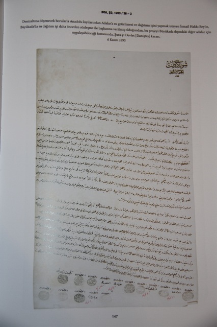 “Denizaltına döşenecek borularla Anadolu kıyılarından Adalar’a su getirilmesi ve dağıtımı işini yapmak isteyen İsmail Hakkı Bey’in, Büyükada’da su dağıtım işi daha önceden sözleşmeyle başkasına verilmiş olduğundan, bu projenin Büyükada dışındaki diğer adalar için uygulanabileceği” konusunda, Şurayı Devlet (DANIŞTAY) kararı.