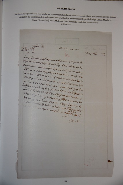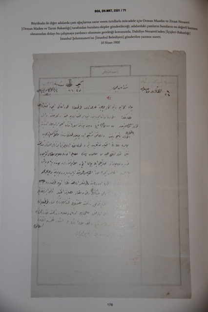 “Büyükada ve diğer adalarda çam ağaçlarına zarar veren tırtıllarla mücadele için Orman Maadin ve Ziraat Nezareti tarafından buralara ekipler gönderileceği, çamların buraların en değerli hazinesi olmasından dolayı bu çalışmaya yardımcı olunması gerektiği” konusunda Dahiliye Nezareti’nden İstanbul Şehremaneti’ne gönderilen yazı…