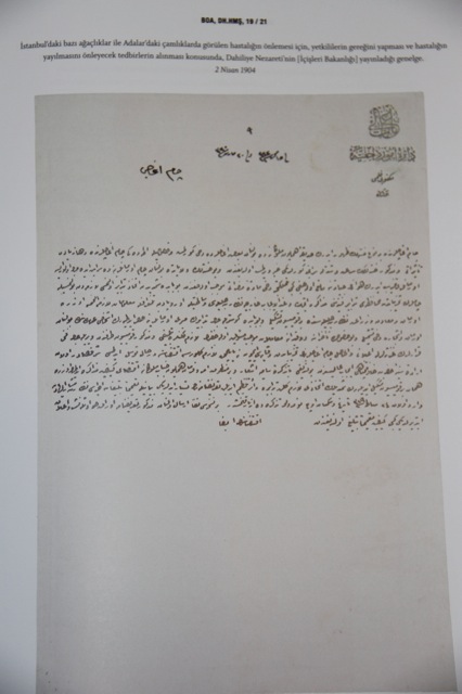 “İstanbuldaki bazı ağaçlıklar ile Adalar’daki çamlıklarda görülen hastalığın önlenmesi için yetkililerin gereğini yapması ve hastalığın yayılmasını önleyecek tedbirlerin alınması” konusunda, Dahiliye Nezareti’nin yayınladığı genelge…