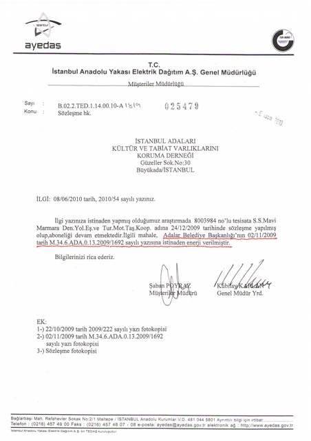 Adalar Belediye Başkanlığı’nın 02.11.2009 tarih 1692 sayılı yazılarına göre elektirik verdiklerini ikrar ediyor.