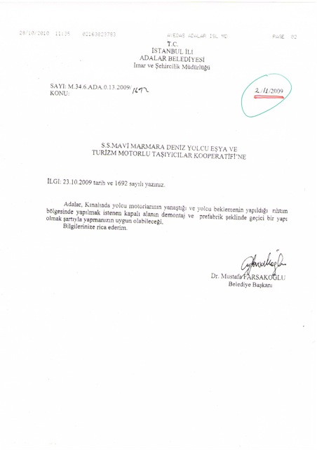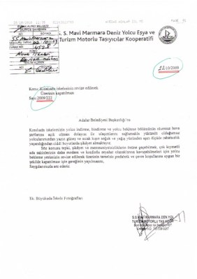 2) Motörcü şirket, Adalar Belediyesi’ne 22.10.2009 tarihinde, yolcular yazın güneşten kışın soğuktan mutazarrır oluyorlarmış da… “çok kıymetli ada sakinlerinin daha modern ve konforlu seyahat olanaklarına kavuşabilmeleri,”ni karşılamak ve sanki orada mevcut bir iskele varmış da onu tentelerle kapamak gibi bir düzeni ifade eden dilekçelerini veriyorlar…