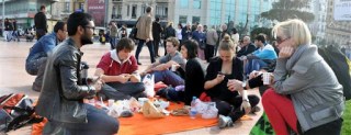 İSTANBUL – Taksim Meydanı’na ayrı ayrı gelen öğrenciler, Cumhuriyet Anıtı çevresindeki yeşil alana ve beton zemine piknik sofrası kurdu. Öğrenciler, vatandaşların şaşkın bakışları arasında burada piknik ortamı yarattı.