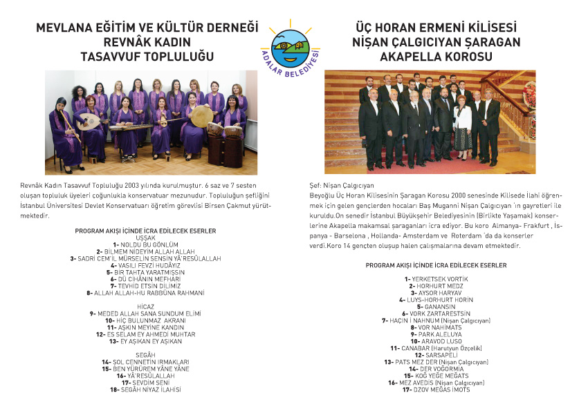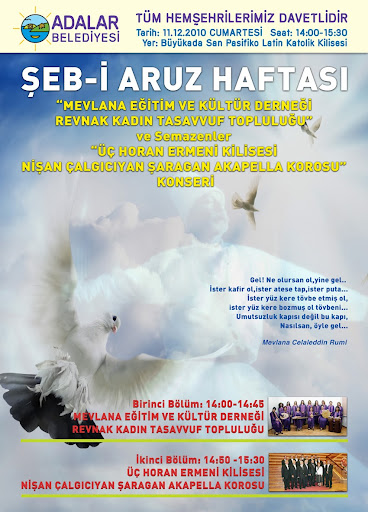 San Pacifiko Latin Katololik Kilisesinde verilecek olan Mevlana Eğitim Kültür Derneği Revnak Kadın Tasavvuf Topluluğu ve Semazenler, Üç Horan Ermeni Kilisesi Nişan Çalgıcıyan Şaragan Acapella Korosu Konserinde tüm hemşehrilerimizi görmekten onur duyacağız.