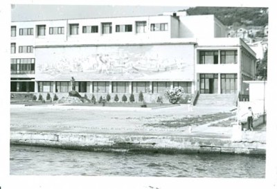 Iskeleden bakilinca kurumun en eski iki binasi sol tarafta bulunuyor ve hala egitim amaciyla kullaniliyor. Uzerinde adanin sembolu haline gelmis, ressam Ferruh Basaga’nin yaptigi, Preveze Savasi’ni betimleyen (7×30 mt) 210 m2’lik mozaik panonun bulundugu, daha yeni ucuncu bina, Mayis 2001’de, panoyla beraber yikildi.”