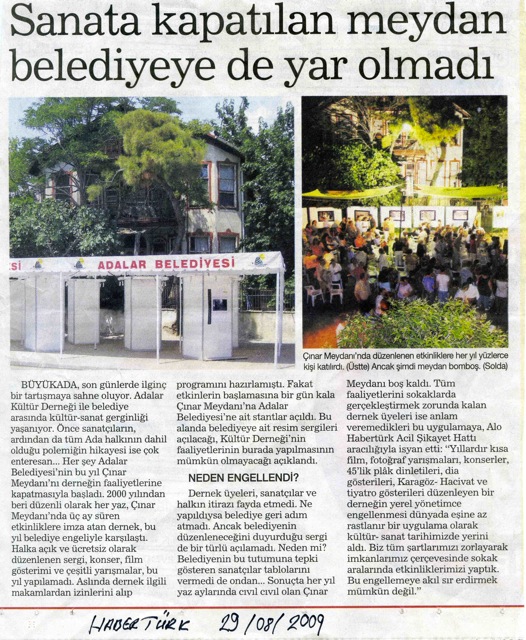 4- Adalar Kültür Derneği: “Kurulduğundan bu yana 16 yılı geride bırakan ve bu süre içinde çok çalışarak Adalar’da önemli bir sivil toplum kuruluşu haline gelen Adalar Kültür Derneği son iki senedir çeşitli baskılarla karşılaşıyor. Adalar Kültür Derneği’nin yaklaşık on yıldır Çınar Meydanı’nda süren kültür- sanat faaliyetleri Adalar Belediyesi tarafından engelleniyor…”